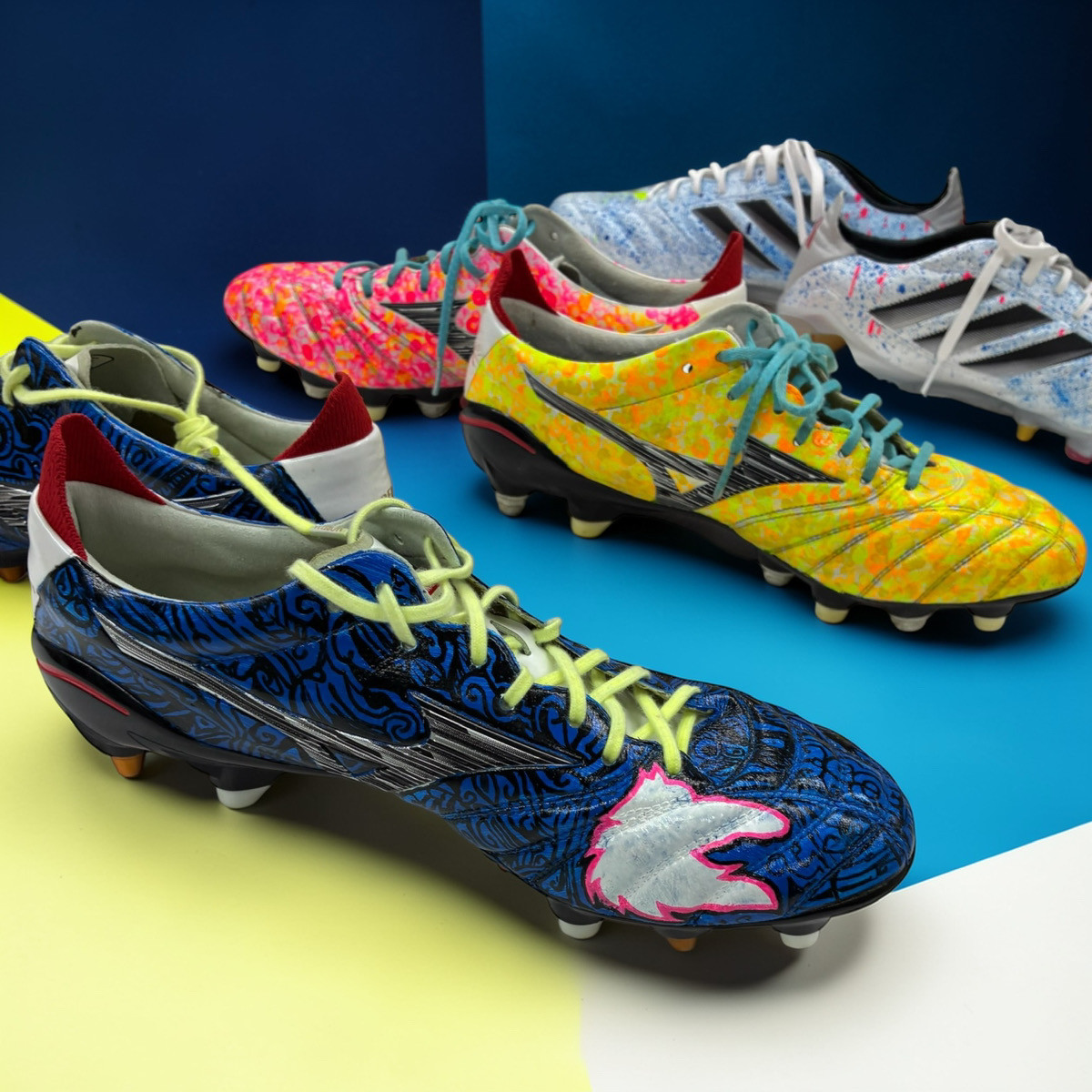 利用者さん一人ひとりの自由な発想や表現を、実際に選手が履くスパイクという形に落とし込み、世界に一つだけの作品として届けています。